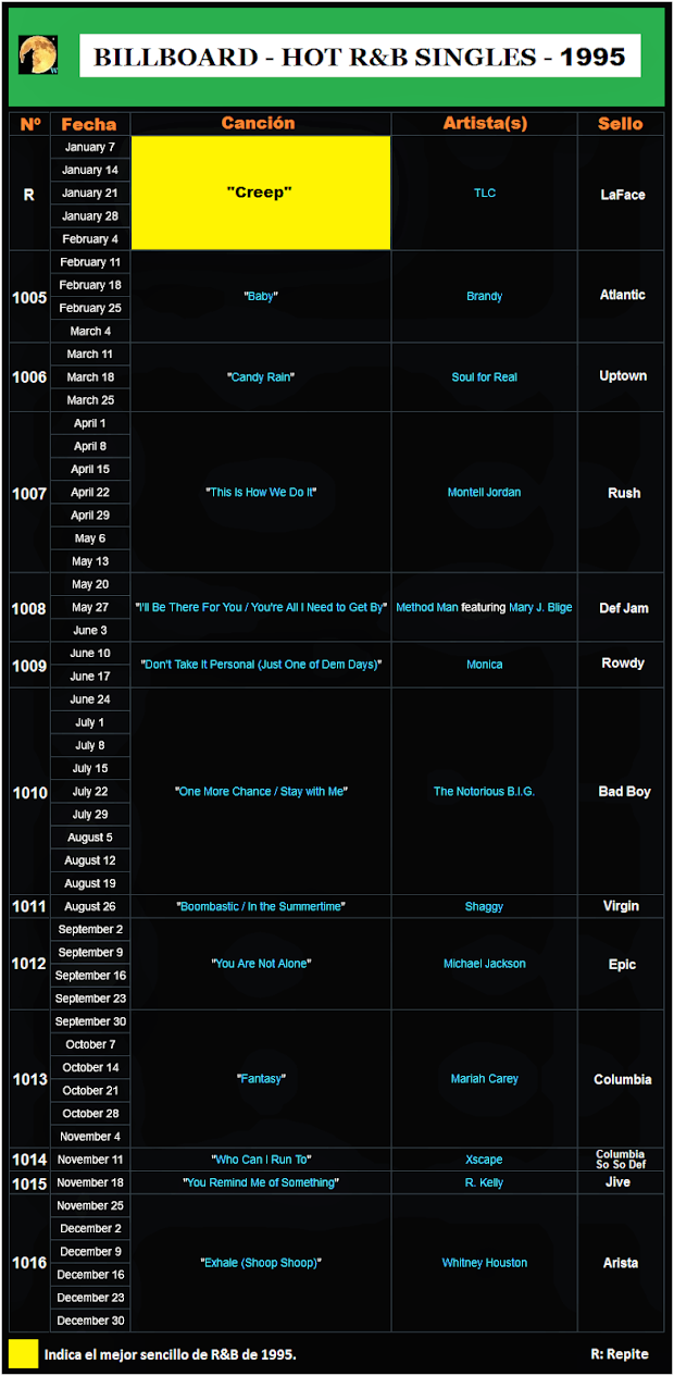 En la edición de Billboard del 7 de enero, la posición número uno la ocupó "Creep" de TLC, la quinta semana del sencillo en el primer puesto, que inició su carrera el 10 de diciembre del pasado año. Se mantendría hasta el 11 de febrero completando 9 semanas al tope de la lista.